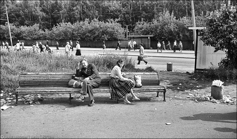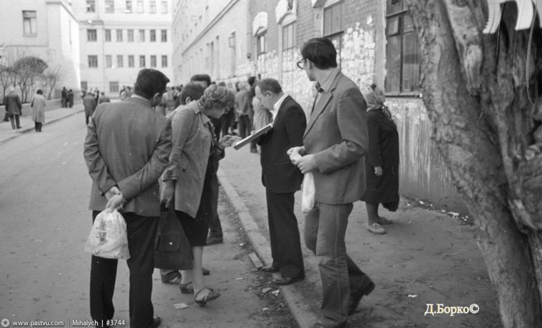 65. У винного магазина. Фотография сделана либо в конце обязательного обеденного перерыва (с 13 до 14), либо в «час волка», в 11 утра, когда на часах у театра Образцова выскакивал волк и открывались магазина с алкоголем. Антиалкогольная кампания начнется через год.
