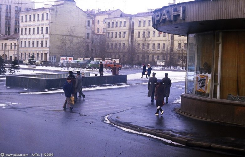 05. Улица 25 октября, сейчас — Никольская. В этой палатке не только чистят обувь, но и продают сумки и нитки, поэтому вокруг толпятся женщины, которые, скорее всего, приехали из области закупаться в «золотом треугольнике» ГУМ-ЦУМ-Детский мир. Справа — вход в подземный общественный туалет.