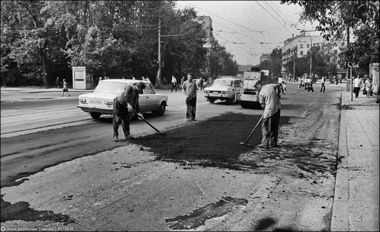 64. На Первомайской кладут асфальт. Тонким слоем, зато свои, не гастарбайтеры какие-нибудь. Шутки тех лет: