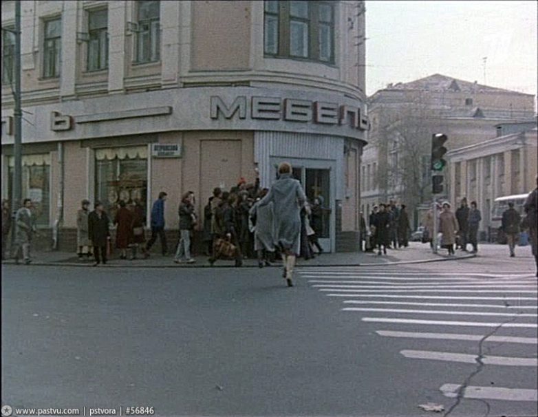 22.Это кадр из фильма “Счастливая Женька!”, в который попал магазин «Мебель» на Петровке. С ним у москвичей связаны самые теплые воспоминания. Ранним утром, до открытия магазина, надо было записаться в специальную тетрадь у «отметчика» — встать в очередь. Если вовремя не пришел на перекличку, из списка вычеркивали.