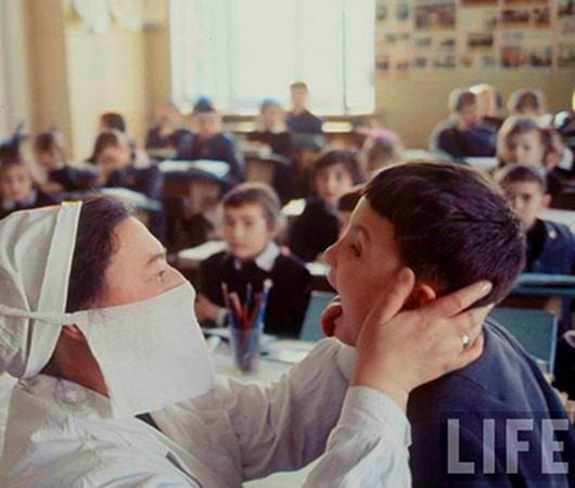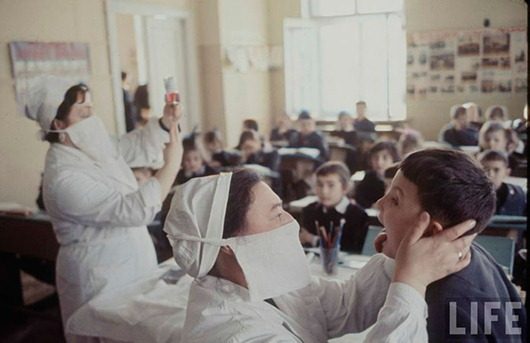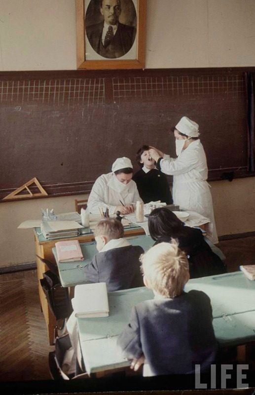 Помню, что в школе периодически наведывалась медсестра в класс и осматривала голову и кожу на животе на чесотку и педикулёз. Раз в год среди урока в класс заглядывала зубная медсестра и вызывала на осмотр. Жуть! Как вспомню эту страшную бормашину — аж вздрогну! Что мешало просто обязать ученика сходить в нормальную стоматологию с нормальным оборудованием и соответствующей санитарией и принести в школу справку о состоянии зубов, что при вонючей советской власти было так важно?
