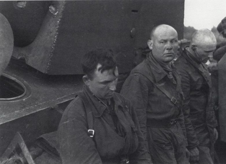 Пленные советские танкисты из состава 2-й танковой дивизии 3-го мехкорпуса Северо-Западного фронта у своего танка КВ-1. В конце июня 1941 года в районе города Расейняй вместе с другим КВ-1 этой же части вел бой за развилку дорог. После потери возможности вести огонь был окружен немецкими солдатами, уцелевшие члены экипажа были взяты в плен после того, как немцам удалось сорвать ломом крышку люка механика-водителя.