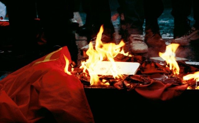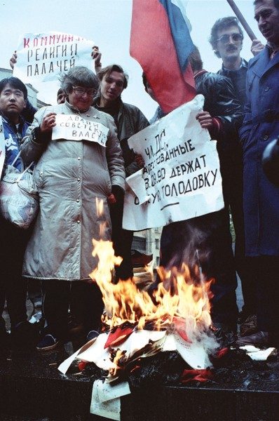 В этот раз она затеяла сожжение Советской конституции и флага СССР. Наши ребята звали ее «кормилицей». Когда нечего было снимать, достаточно было податься к Моссовету, напротив котого всегда Новодворская что-нибудь да отмочит.