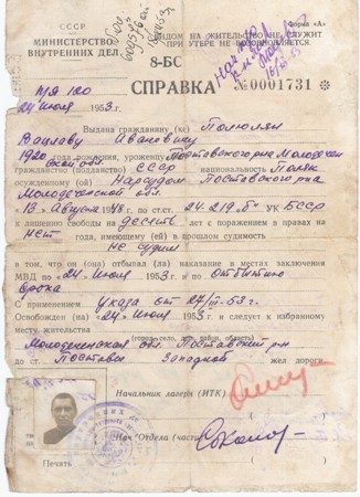 В Справке 8-БС, выданной В.И. Полюляну 24 июля 1953 года, в частности, отмечалось, что осужденный «отбывал наказание в местах заключения МВД по июль 1953 года и по отбытию срока с применением указа от 27 марта 1953 года освобожден и следует к избранному месту жительства, а именно в Молодечненскую область, Поставский район, город Поставы».