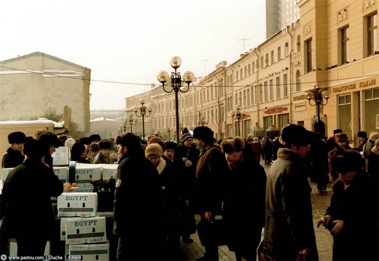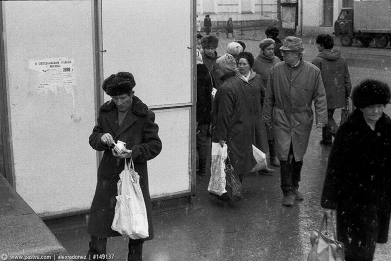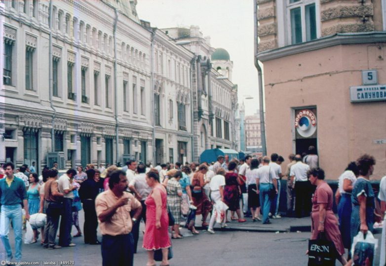 Магазин «Березка» на Большой Дорогомиловской. В начале 1988-го правительство объявило о ликвидации системы торговли за чеки в ходе кампании «по борьбе с привилегиями» и «за социальную справедливость», и сеть «Березок» была закрыта. Возник ажиотажный спрос и очереди: владельцы чеков пытались любыми способами избавится от них до даты объявленного закрытия, получить хоть что-нибудь.