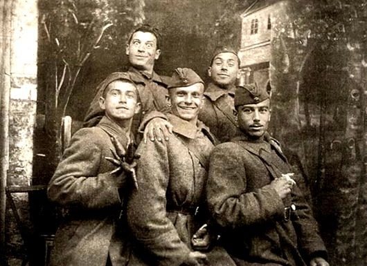 Юрий Тимошенко (в первом ряду в центре) и Ефим Березин (справа в верхнем ряду) — артисты концертной бригады ансамбля песни и танца Юго-Западного фронта, 1942 год.