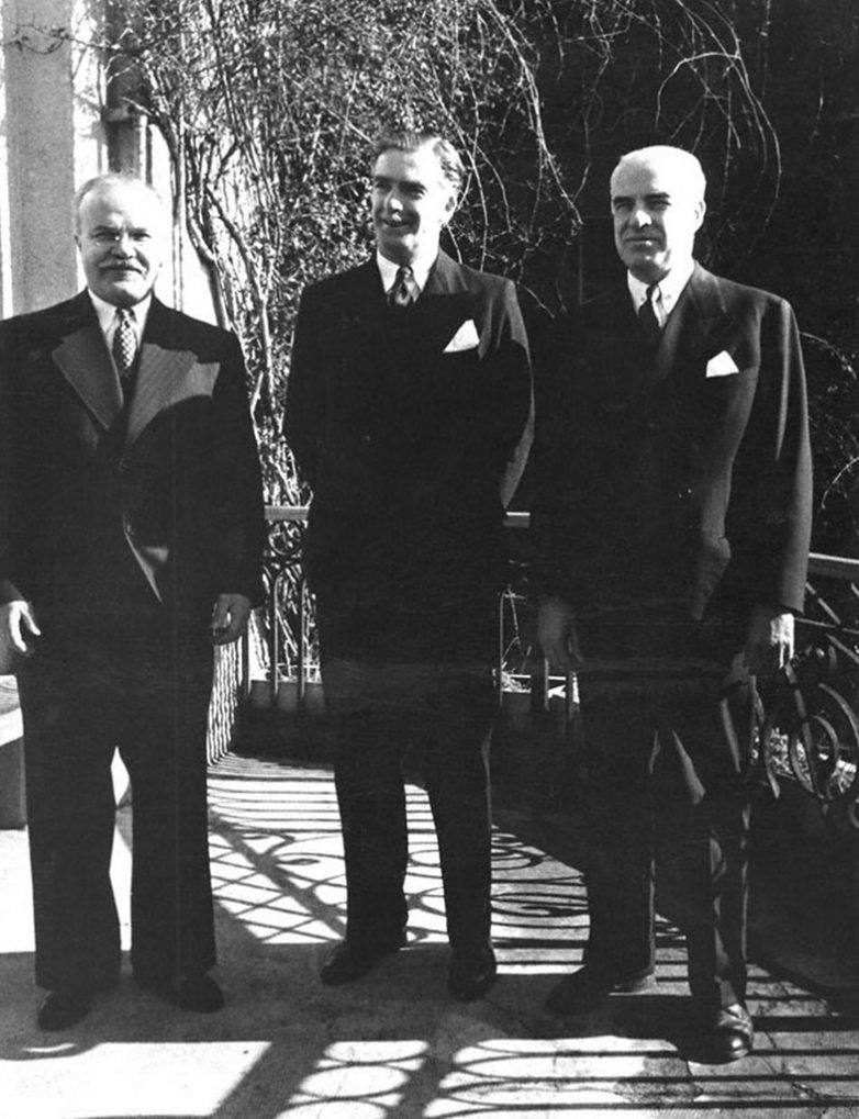 Перед началом заседания Крымской конференции. Нарком иностранных дел В. М. Молотов, министр иностранных дел А. Иден и госсекретарь США Э. Стеттиниус в Ливадийском дворце