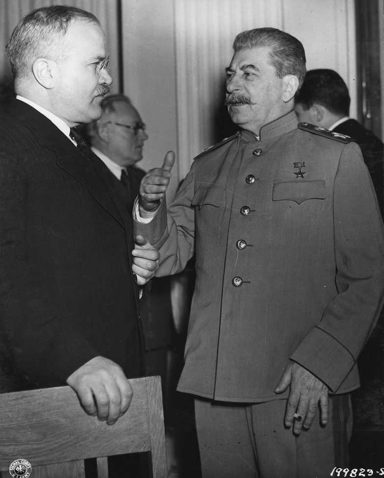 Маршал Советского Союза, председатель СНК СССР и председатель ГКО СССР И. В. Сталин разговаривает с Наркомом иностранных дел СССР В. М. Молотовым на Ялтинской конференции