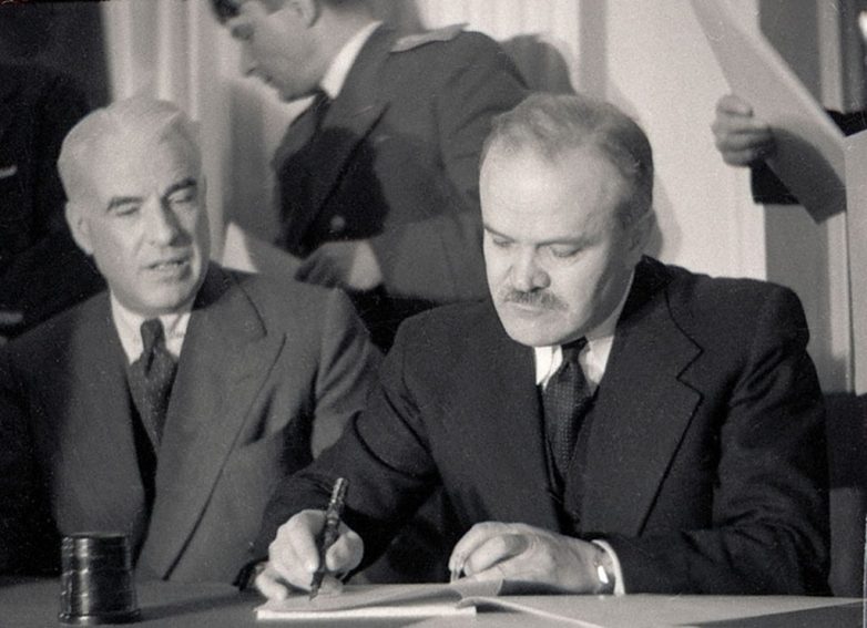 Нарком иностранных дел СССР В. М. Молотов подписывает документы Ялтинской конференции. Слева Госсекретарь США Э. Стеттиниус