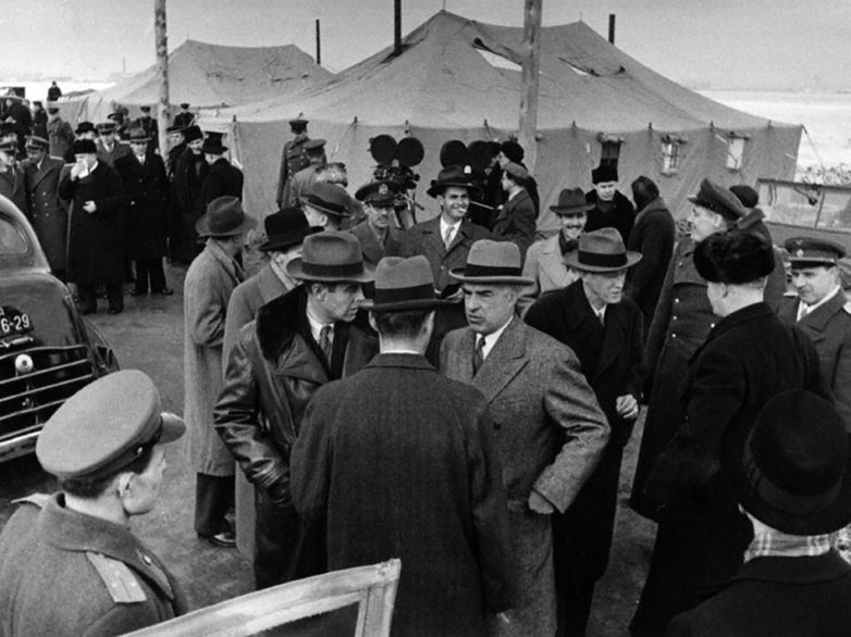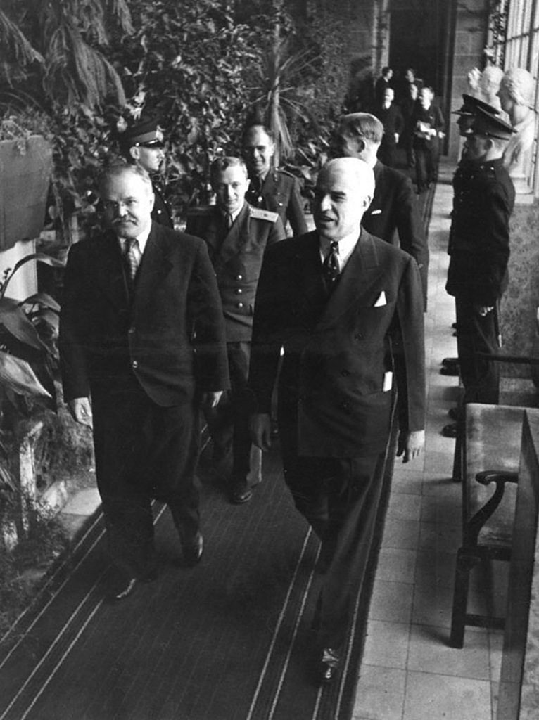 Президент США Франклин Рузвельт (Franklin D. Roosevelt, 1882—1945) разговаривает с Наркомом иностранных дел СССР Вячеславом Михайловичем Молотовым (1890—1986) на аэродроме Саки в окрестностях Ялты. На втором плане третий слева — Нарком ВМФ СССР адмирал флота Николай Герасимович Кузнецов (1904—1974)