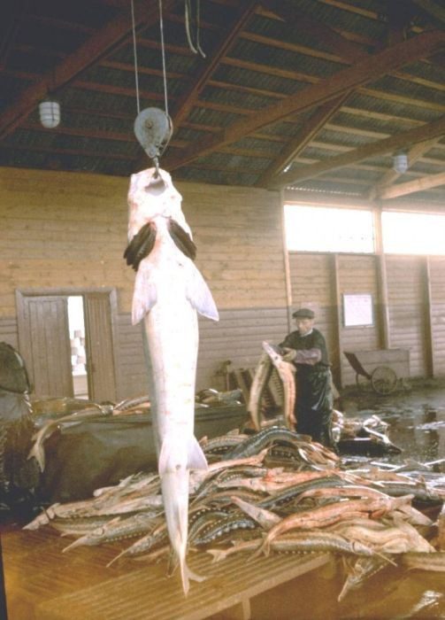 На фото полный спектр осётр, севрюга, белуга. (стерляди не увидел) Самая большая белуга была выловлена (не нами) 300 кг, мясо у неё по сравнению с остальными не очень, но икра превосходит всех по вкусовым качествам. А ещё из вязиги (спинного хряща) пекли очень вкусные пироги.