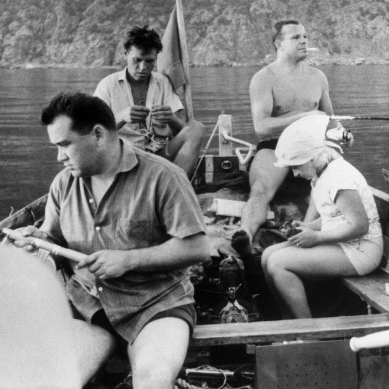 Юрий Гагарин на рыбалке в «Артеке». Рядом с Гагариным — композитор Александра Пахмутова, 1965 год
