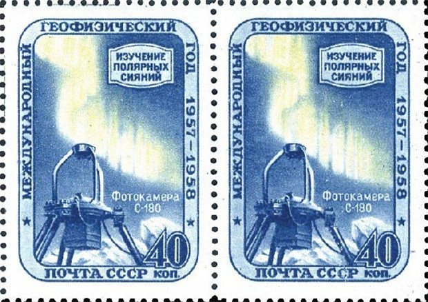 Пара 40-копеечных почтовых марок СССР 1958 г. «Изучение полярных сияний» из серии «Международный геофизический год», в редкой разновидности с линейной перфорацией, была продана с аукциона за $14 500.