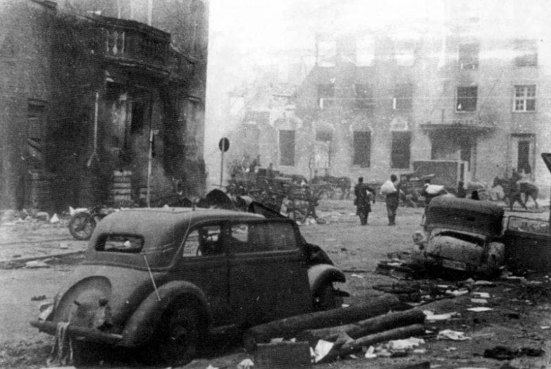 Разбитые автомобили на улице взятого штурмом Кенигсберга.