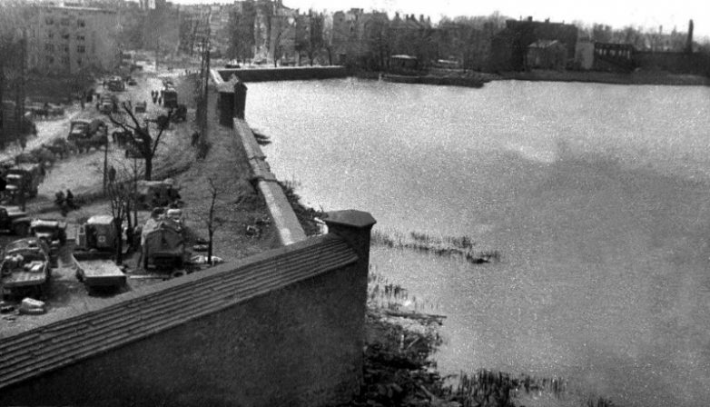 Советские солдаты идут по набережной разрушенного в боях Кенигсберга.