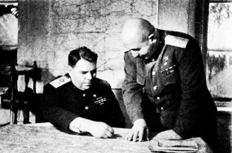 Командующий 3-м Белорусским фронтом Маршал Советского Союза А.М. Василевский (слева) и его заместитель генерал армии И.Х. Баграмян уточняют план штурма Кенигсберга.