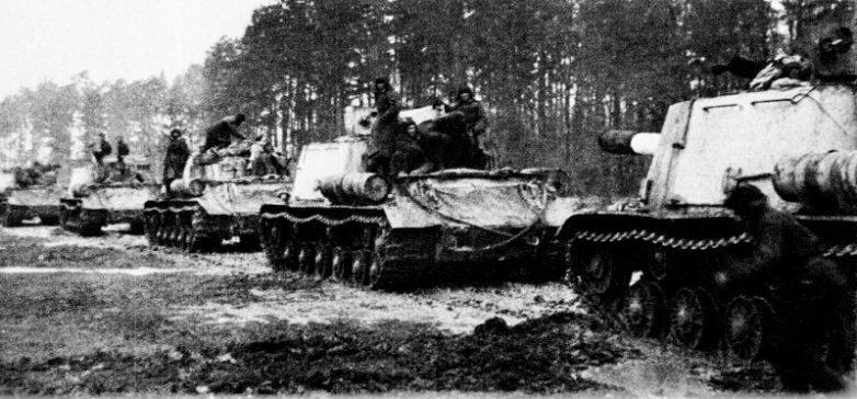 Советская САУ ИСУ-122С ведет бой в Кенигсберге.