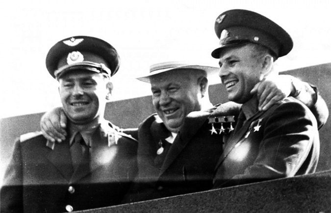 Космонавты Герман Титов и Юрий Гагарин на трибуне