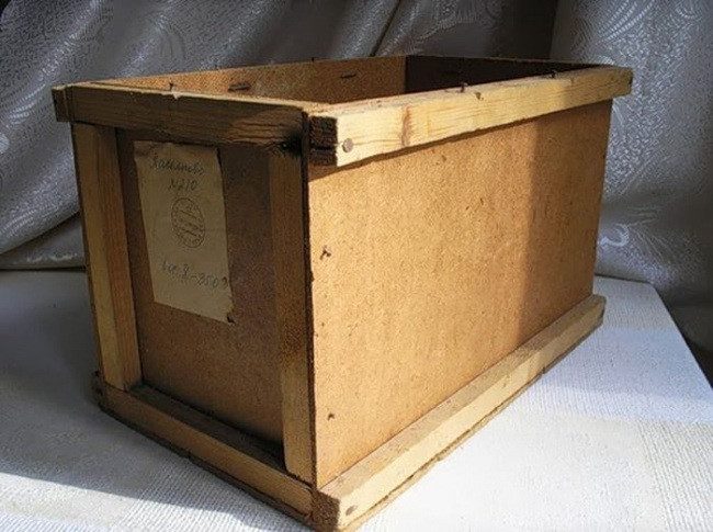 Посылочные ящики были из фанеры, обколоченной деревянными штапиками. Крышку приколачивали гвоздиками. На фанерке, являющейся лицевой стороной, писали адрес.