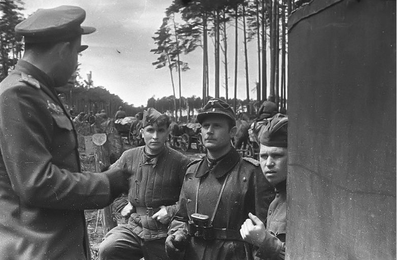 27. Капитуляция немцев на косе Фриш-Нерунг, Восточная Пруссия. Немецкие офицеры принимают от советского офицера условия капитуляции и порядок сдачи в плен. 09.05.1945 г.