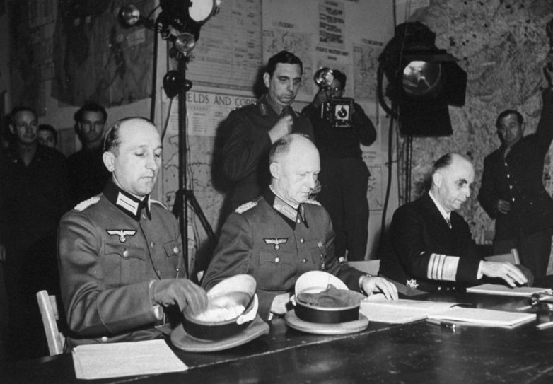 5. Генерал-полковник Альфред Йодль (в центре) подписывает капитуляцию Германии в штаб-квартире союзных войск в Реймсе в 02.41 местного времени 7 мая 1945 года. Рядом с Йодлем сидят гросс-адмирал Ганс Георг фон Фридебург (справа) и адъютант Йодля майор Вильгельм Оксениус.