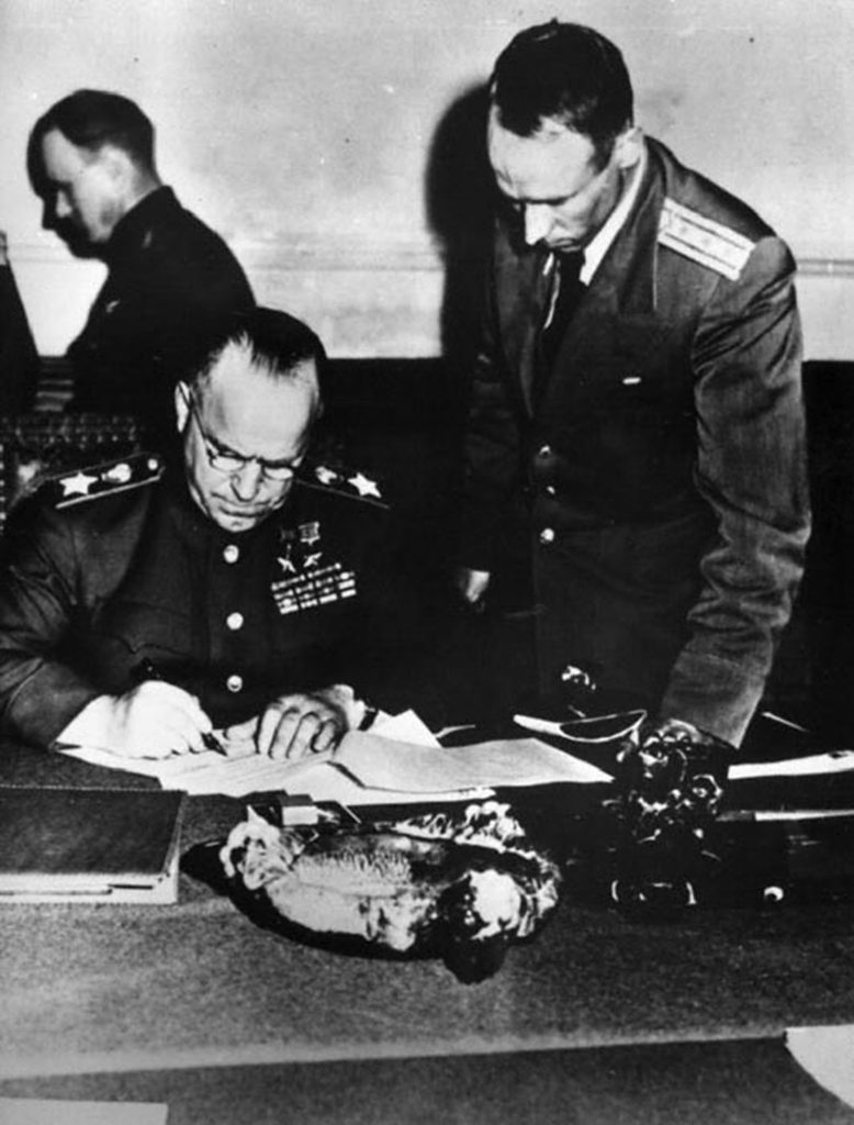 37. Командующий 1-м Белорусским фронтом Маршал Советского Союза Жуков Г.К. подписывает Акт о безоговорочной капитуляции всех вооруженных сил Германии.