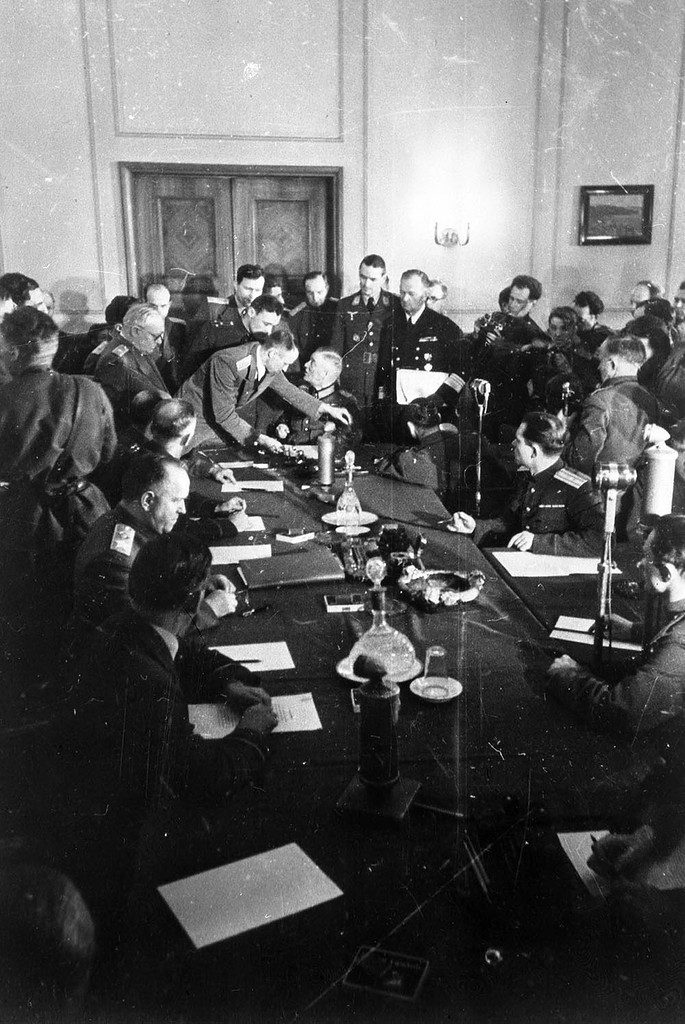 30. Фельдмаршал Вильгельм Кейтель подписывает Акт о безоговорочной капитуляции Германии. Берлин, 8 мая 1945 г., 22:43 по центральноевропейскому времени (9 мая в 0:43 по московскому времени).