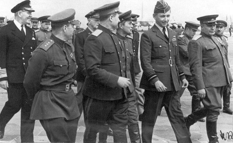 На фото слева направо: Начальник военной миссии СССР во Франции генерал-майор Иван Алексеевич Суслопаров (1897—1974), начальник штаба сил союзников в Европе британский генерал-лейтенант сэр Фредерик Морган Morgan, 1894—1967), американский генерал-лейтенант Беделл Смит, американский радиокомментатор Гарри Бутчер, американский генерал Дуайт Эйзенхауэр, британский маршал авиации Артур Теддер и начальник штаба британского флота адмирал сэр Харольд Бьюрро.