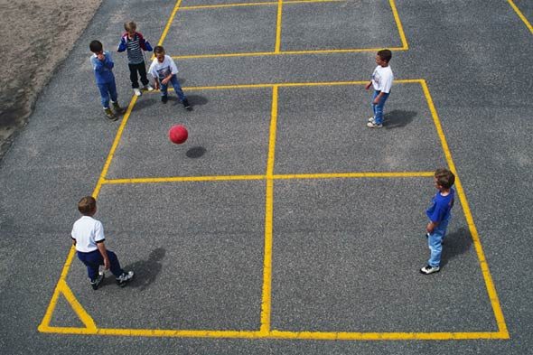 Для игры нужен был крупный мяч и кусок кирпича, чтобы нарисовать на асфальте квадрат, разделенный на 4 части, с кругом для подачи посередине.
