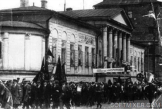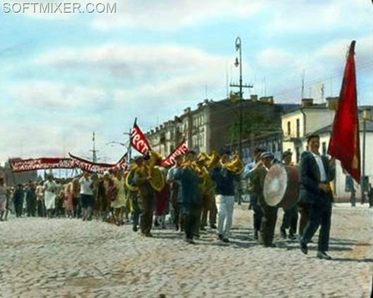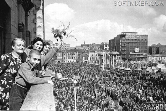 На улицах только люди. Трамвайное движение снято. Можно спокойно идти по середине мостовой. А над нами во всю орет радио. Почти на всех домах на крышах установлены радиорупора. Они настроены на всю громкость. Передаются только праздничные песни. Играет бодрая музыка. Все это создает особое праздничное настроение.