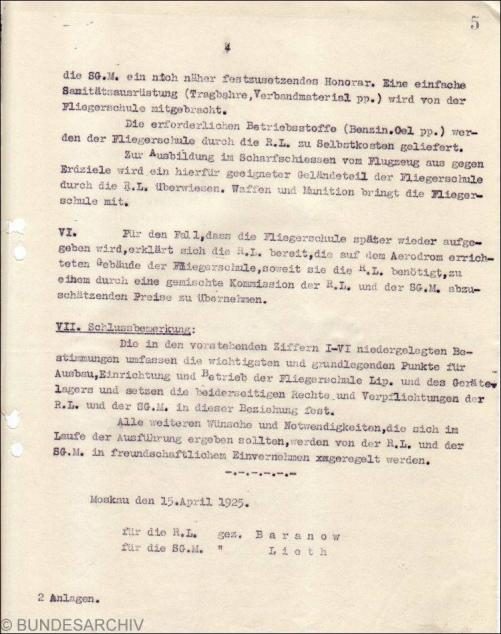 Часть немецко-советского договора о строительстве авиашколы. Внизу подписи Баранова и Лит-Томсена.