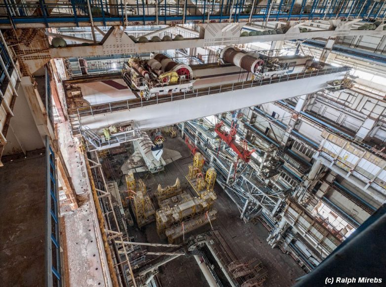 Под потолком двигались три поперечные кран-балки, каждая их которых обладает грузоподъёмностью в 400 тонн. Ещё выше их опутывает сложная система мостков под самой крышей, открывающая доступ к лампам освещения.
