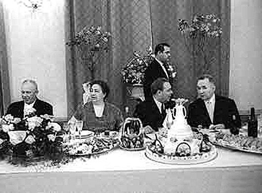 Настоящий расцвет кремлевских банкетов наступил при Хрущеве. На кухне это, правда, не сказалось. Ее ассортимент пополнился в то время в основном за счет украинских блюд. А вот количество приемов, торжественных обедов и прочих мероприятий превышало все разумные пределы. Мало того, не отличавшийся последовательностью Хрущев мог устроить банкет неожиданно для всех или пригласить на уже запланированное мероприятие немалое число нежданных гостей.