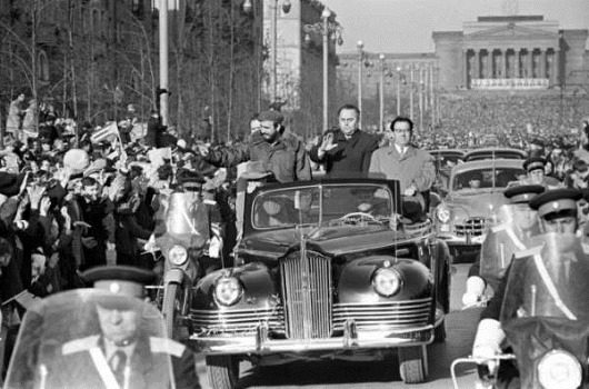 Люди приветствуют Фиделя Кастро (в автомобиле слева) и других кубинских гостей. Первый визит Фиделя Кастро в СССР.