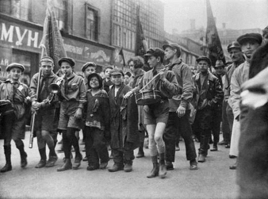 Беспризорники в колонне пионеров на первомайской демонстрации.