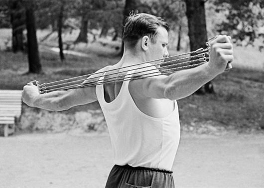 Во-вторых, эспандеры были растяжные, тут основными пользователями были мужчины постарше. Те кто помоложе ходили в секции, а вот более взрослое поколение занималось дома или во дворе. В спортивных «трениках» и заправленной в них майкой мужчины растягивали снаряд, чередуя подходы за спиной и перед грудью.