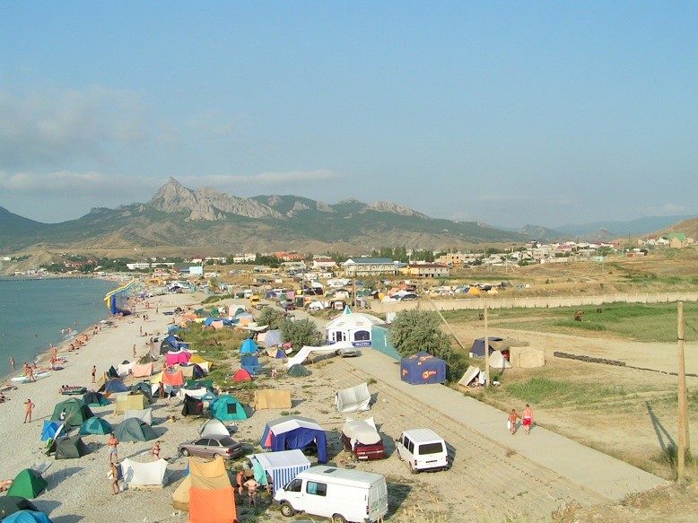 Во времена СССР Коктебель назывался Планерским. На карте кемпинги-стоянки — синие кружки, дикие автостоянки — зеленые.