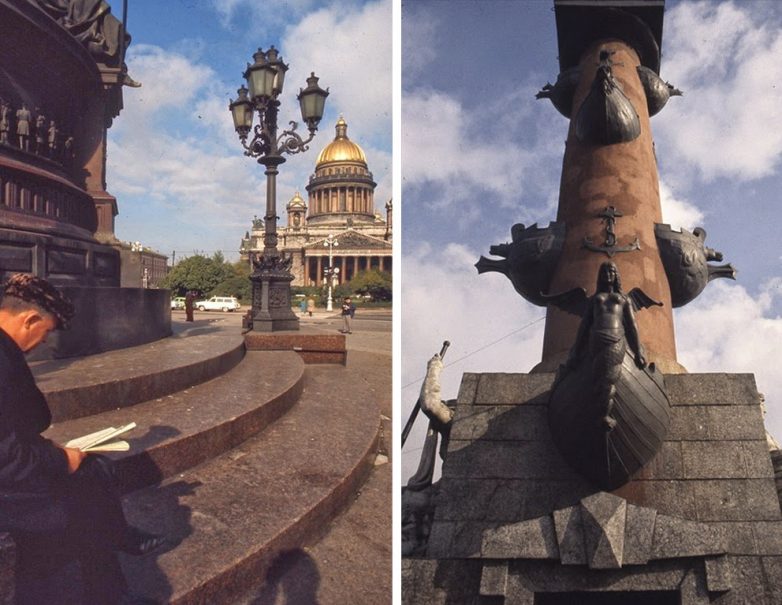 У памятника Николаю I и Ростральные колонны на Стрелке Васильевского острова.
