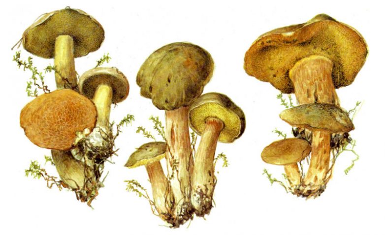 На картинке: моховик желто-бурый, моховик зеленый, моховик пёстрый.