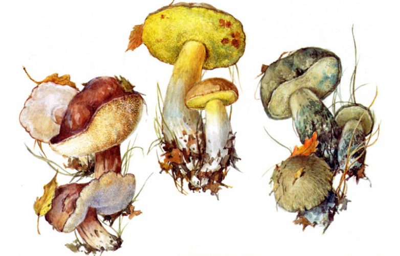 На рисунке представлены довольно редкие грибы: каштановый, полубелый и синяк.