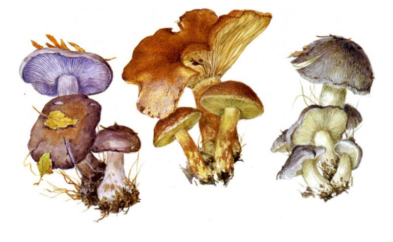 На рисунке: говорушка булавоногая, говорушка душистая, говорушка ворончатая.