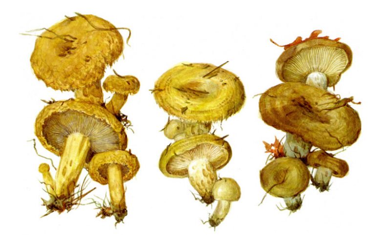 На рисунке: опенок луговой, чесночник, коллибия масляная.
