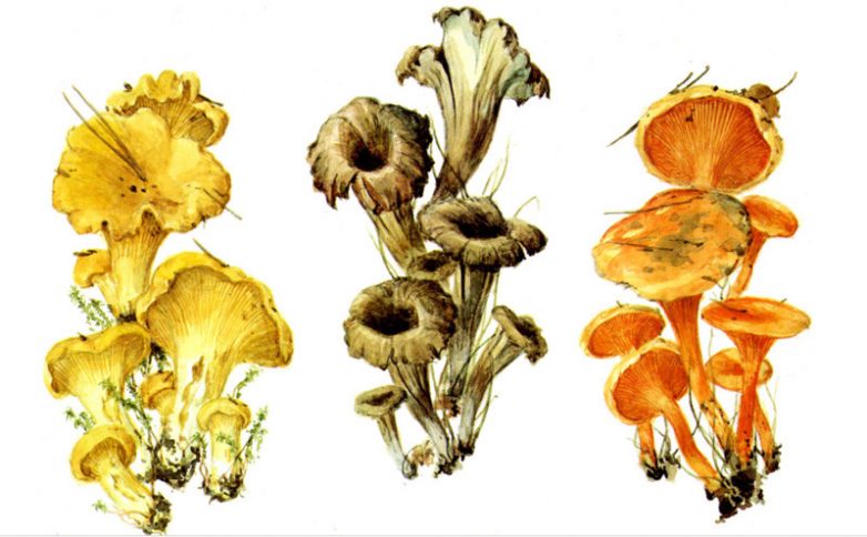 На этом рисунке так же представлены грузди: груздь синеющий, желтый и дубовый. Все они являются съедобными.