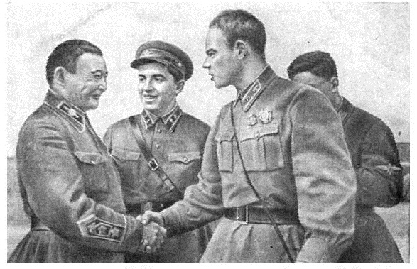Маршал монгольской Народно-революционной армии Х. Чойбалсан поздравляет дважды Героя Советского Союза С. И. Грицевца с высокой правительственной наградой
