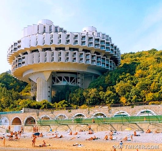 Еще одна архитектурная жемчужина – санаторий «Дружба» в Ялте: он напоминает пирамиду зубчатых шестеренок (каждая из них – это жилой этаж), словно вырастающую из рощи на морском берегу.