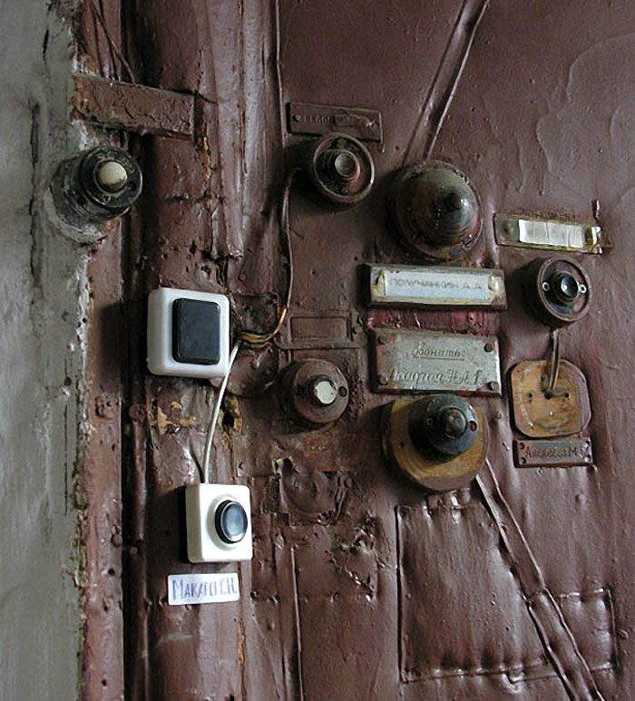 Телефон, тоже один, заляпанный потными руками и шкаф с книгами, которые никто не читал. На входной двери — длиннейший список фамилий с пометками «звонить три раза» или «стучать раз, но сильно», «два долгих звонка, один короткий». А в уборной плакат: «Граждане! Помните, что вы здесь не одни! Люди ждут!»