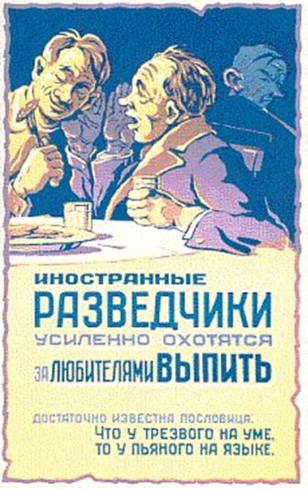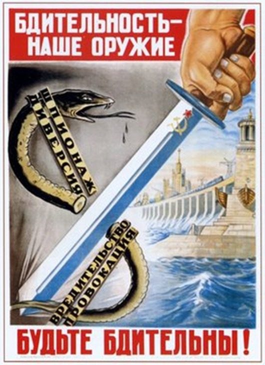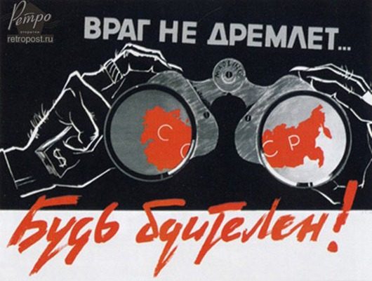 О новом виде врага – шпионе — граждане постепенно начинают слышать больше, чем о ликвидированных кулаках. Согласно пропаганде, иностранный лазутчик бывает как засланным в страну извне, так и завербованным капиталистической разведкой советским гражданином, поэтому бдительным надо быть всегда и везде…
