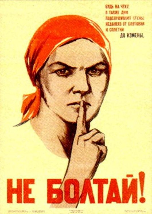 В общем-то у народа не оставалось сомнений, что советские сараи являются стратегической целью для иностранных диверсантов.Фраза «Не болтай» на долгие годы стало символом эпохи, красной нитью прошло от Ильича до Ильича. Я и сам много раз слышал в детстве эту фразу от бабушки… Она знала, что говорила; везде, везде есть уши. Или бдительные граждане!