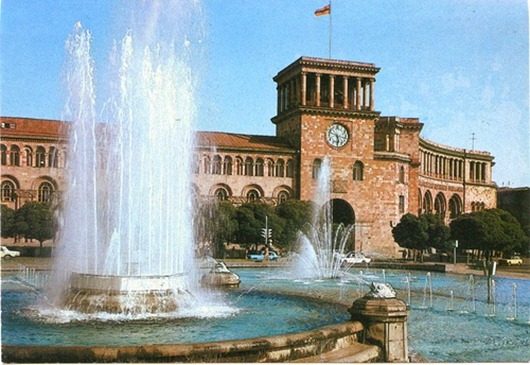 Перед зданием Музея истории Армении стоят легендарные «поющие» фонтаны, одновременное меняющие свой цвет.» Но это уже в наши дни.