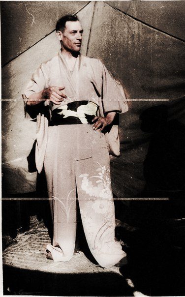 Советский офицер 9-й штурмовой инженерно-саперной бригады примеряет трофейное самурайское кимоно. Манчжурия, август 1945 года.